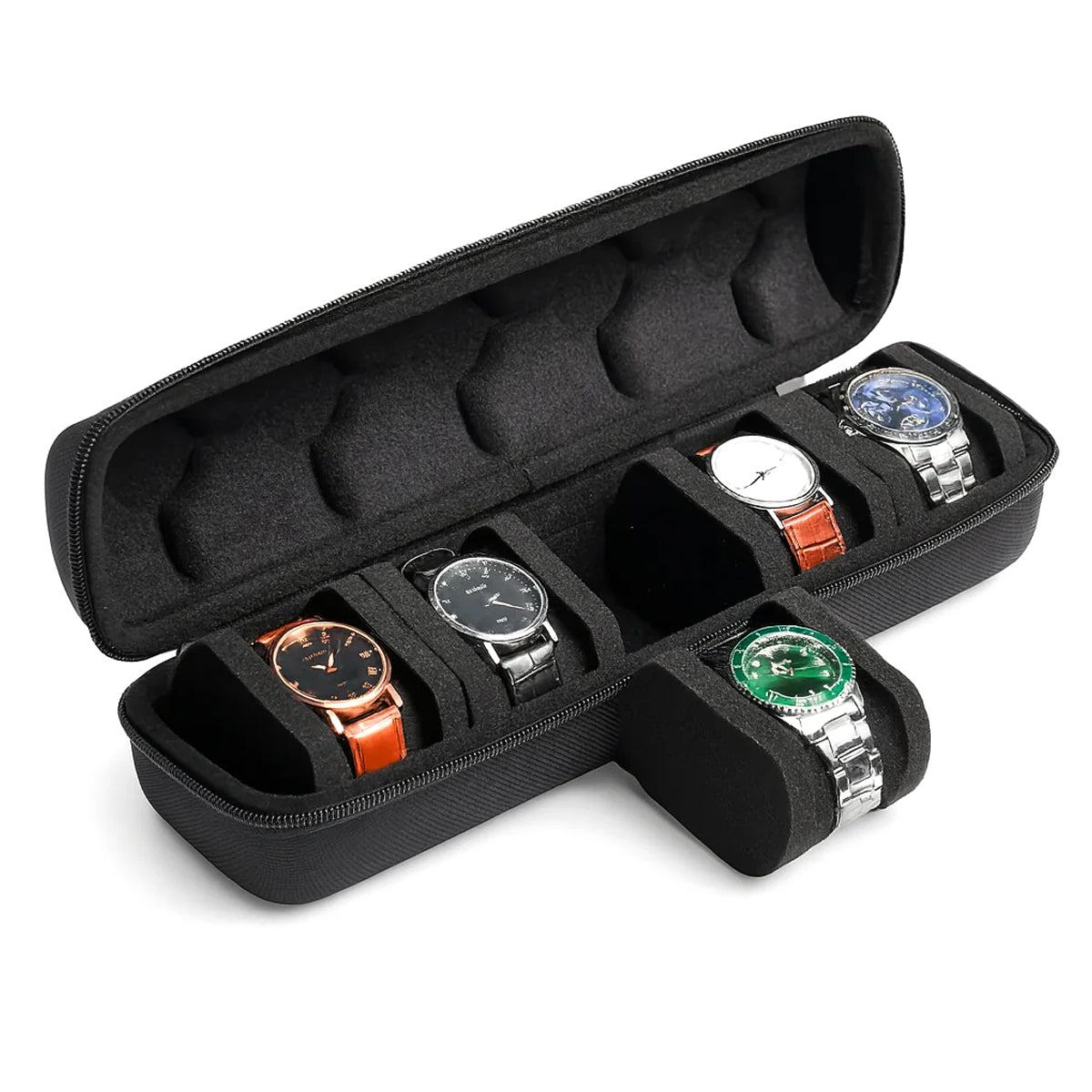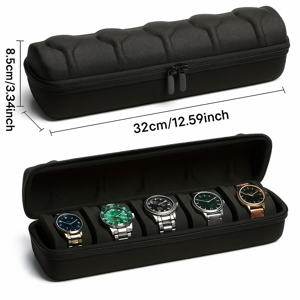 Protect your prized timepieces with this sleek and compact 5-partition watch box pouch Ñ the perfect companion for travel or everyday storage.