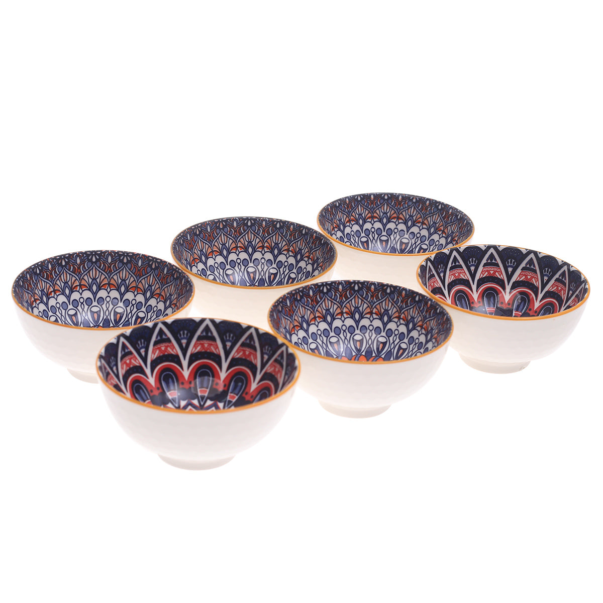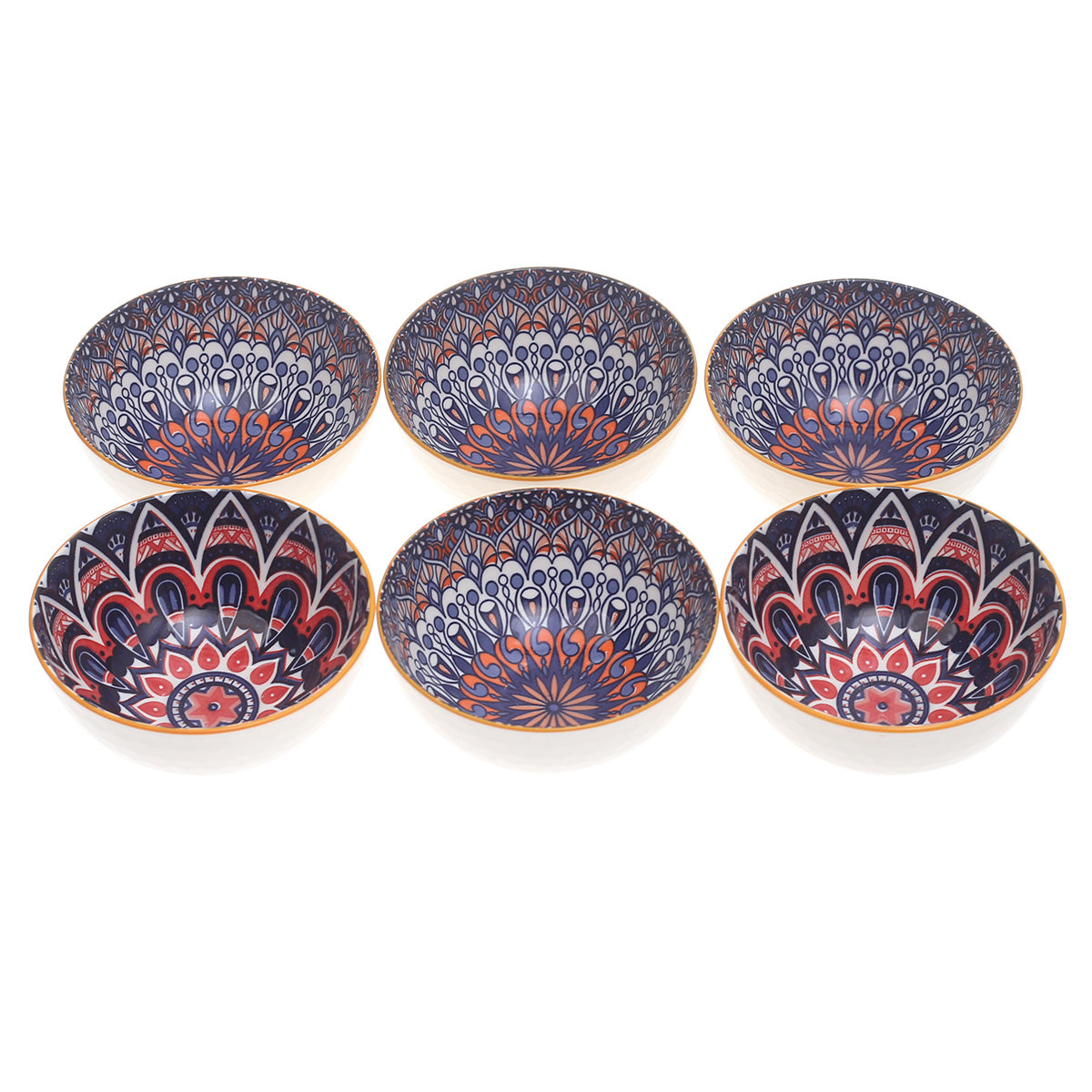 Add a vibrant pop of color and culture to your dining table with the JPY-03 Ceramic Bowl Set. This 6-piece collection features stunning mandala-inspired patterns in rich hues of navy, red, and orange, finished with a warm gold rim.