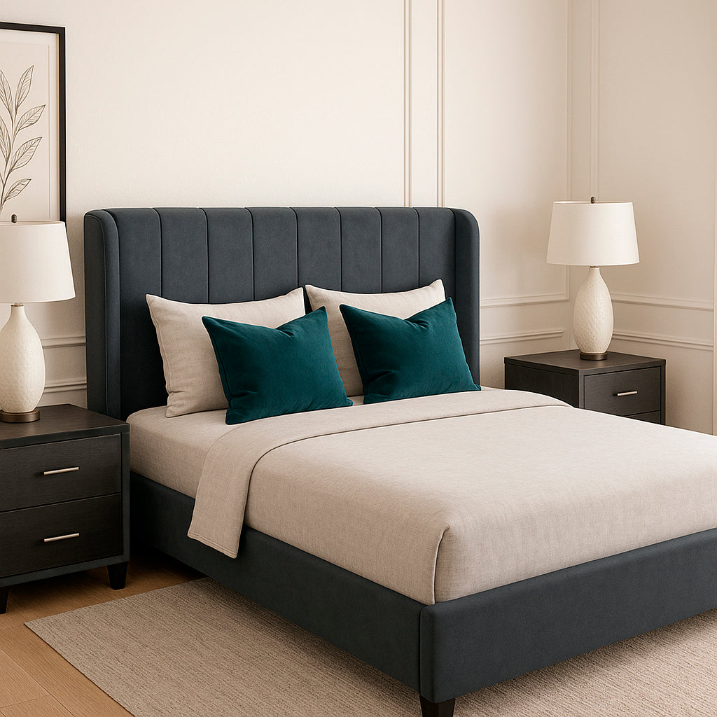 Elevate your bedroom's allure with ayshpk's Kingsley King-size bed. Crafted for regal comfort and style, it features an elegant headboard and comes complete with two matching side tables, offering both aesthetics and convenience. Immerse yourself in the unmatched craftsmanship and quality of this masterpiece, transforming your bedroom into a royal retreat. Experience the luxury you deserve with ayshpk's Kingsley King Size Bed.