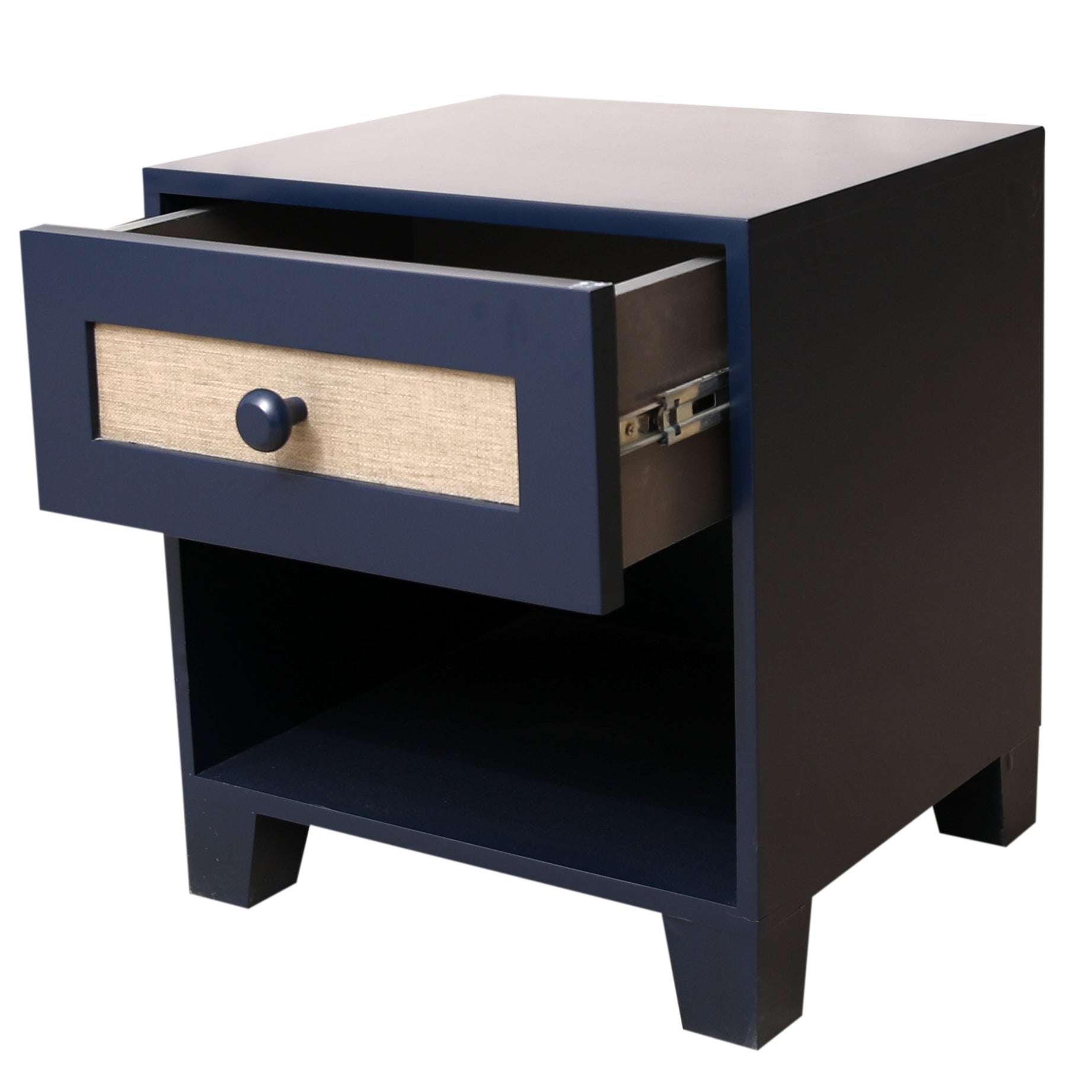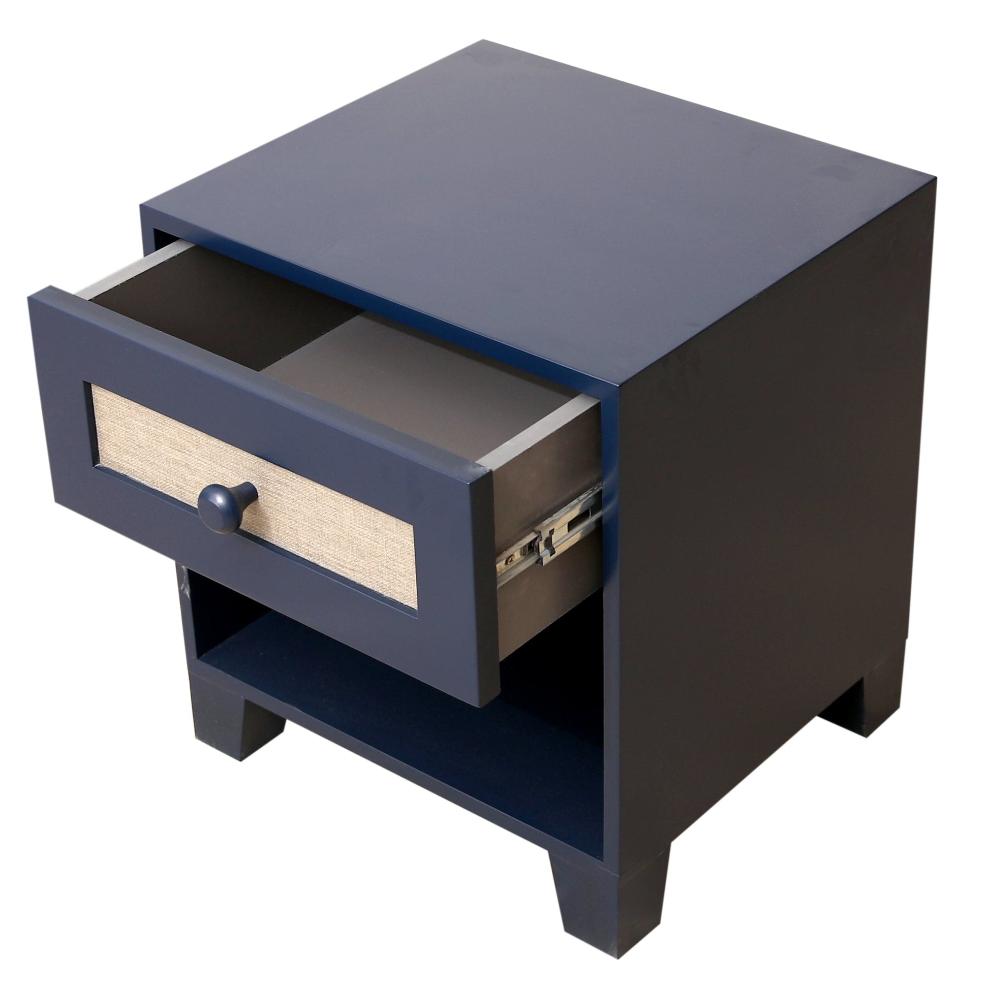 available in bothÊQueen and Single sizes. This stylish piece features a sleek navy-blue frame paired with a light fabric-upholstered headboard and footboard, delivering both comfort and elegance.