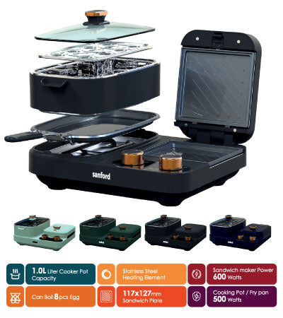 Enjoy the perfect start to your day with the Sanford SF9953SM Breakfast Maker Ð an all-in-one appliance designed for convenience and versatility. This compact unit combines a sandwich maker, cooker pot, and frying pan to prepare your favorite breakfast items quickly and efficiently.
