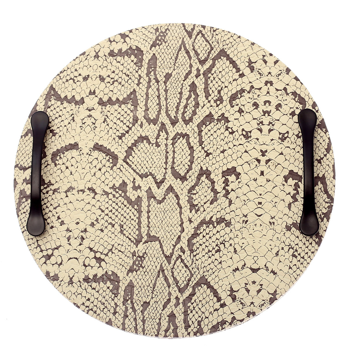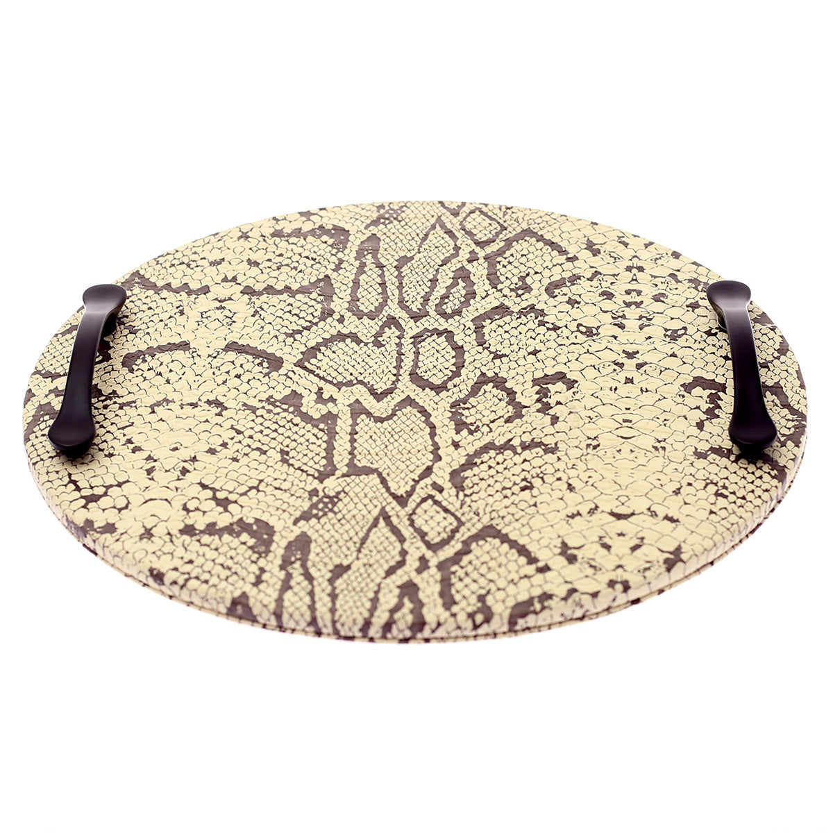 Expertly crafted from high quality leather, this round tray features a striking Black 7 White snake skin design. Perfect for adding a touch of sophistication and elegance to any space, this tray is both functional and stylish. Elevate your home decor with this unique piece.