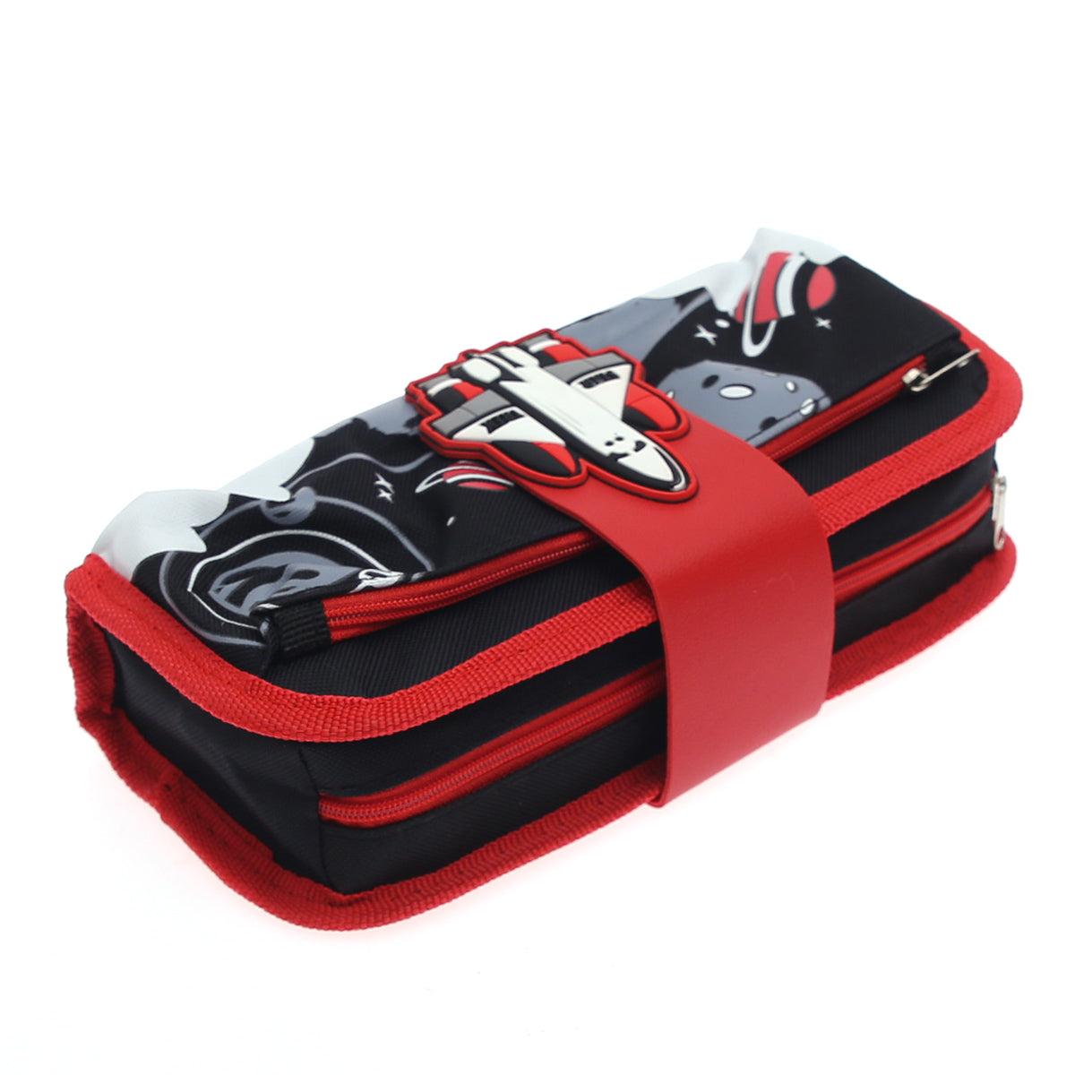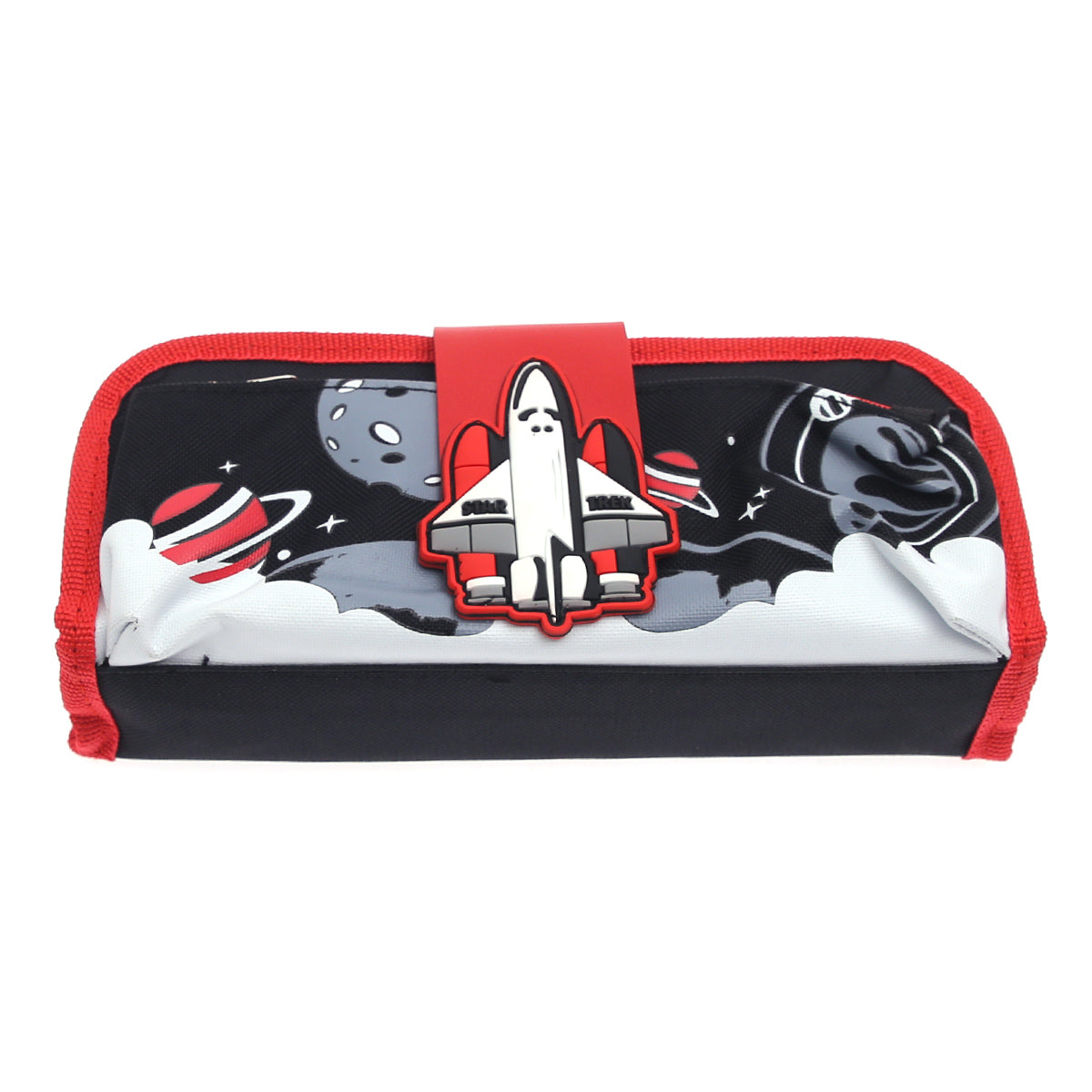 Blast off into learning with this space-themed pencil pouch featuring a bold 3D shuttle badge, galactic planets, and sleek red piping. A fun and functional addition to any kidÕs school gear!