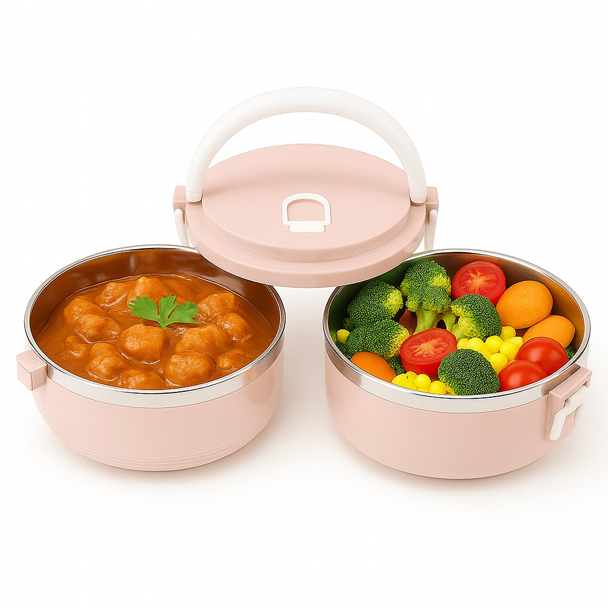 Pack your meals smartly with this Stainless Steel Dual Lunch Box, designed for convenience and insulation. With two stackable compartments and a central locking lid, this lunch box keeps food separated, secure, and fresh for longer. The comfortable carry handle makes it perfect for office, school, or travel.