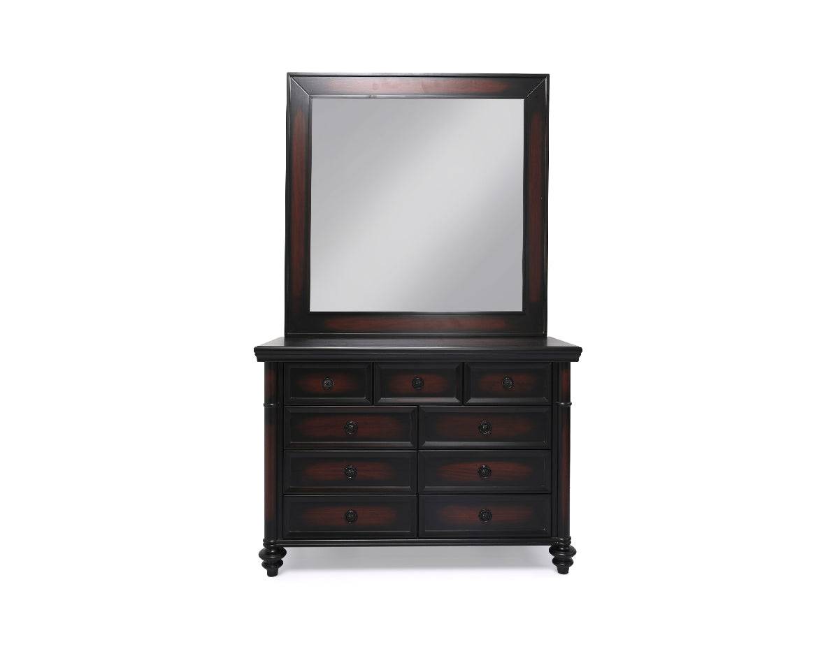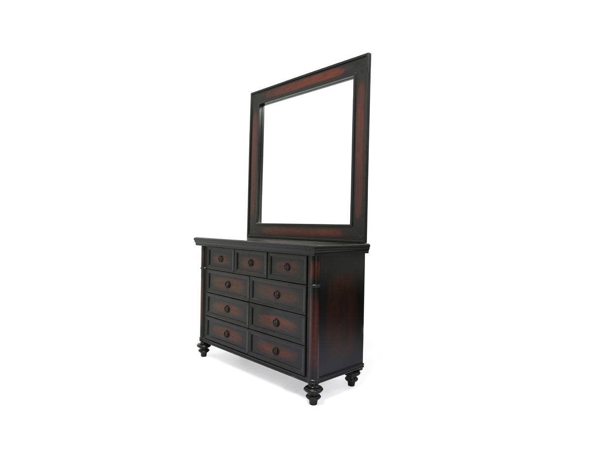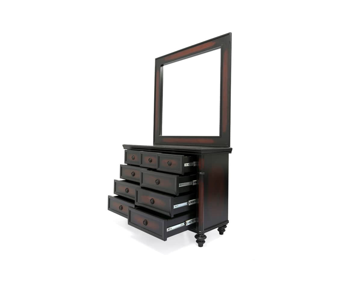 Grand large dresser with thick polished drawers and carving details on it, thick solid wood legs, topped with a large mirror.